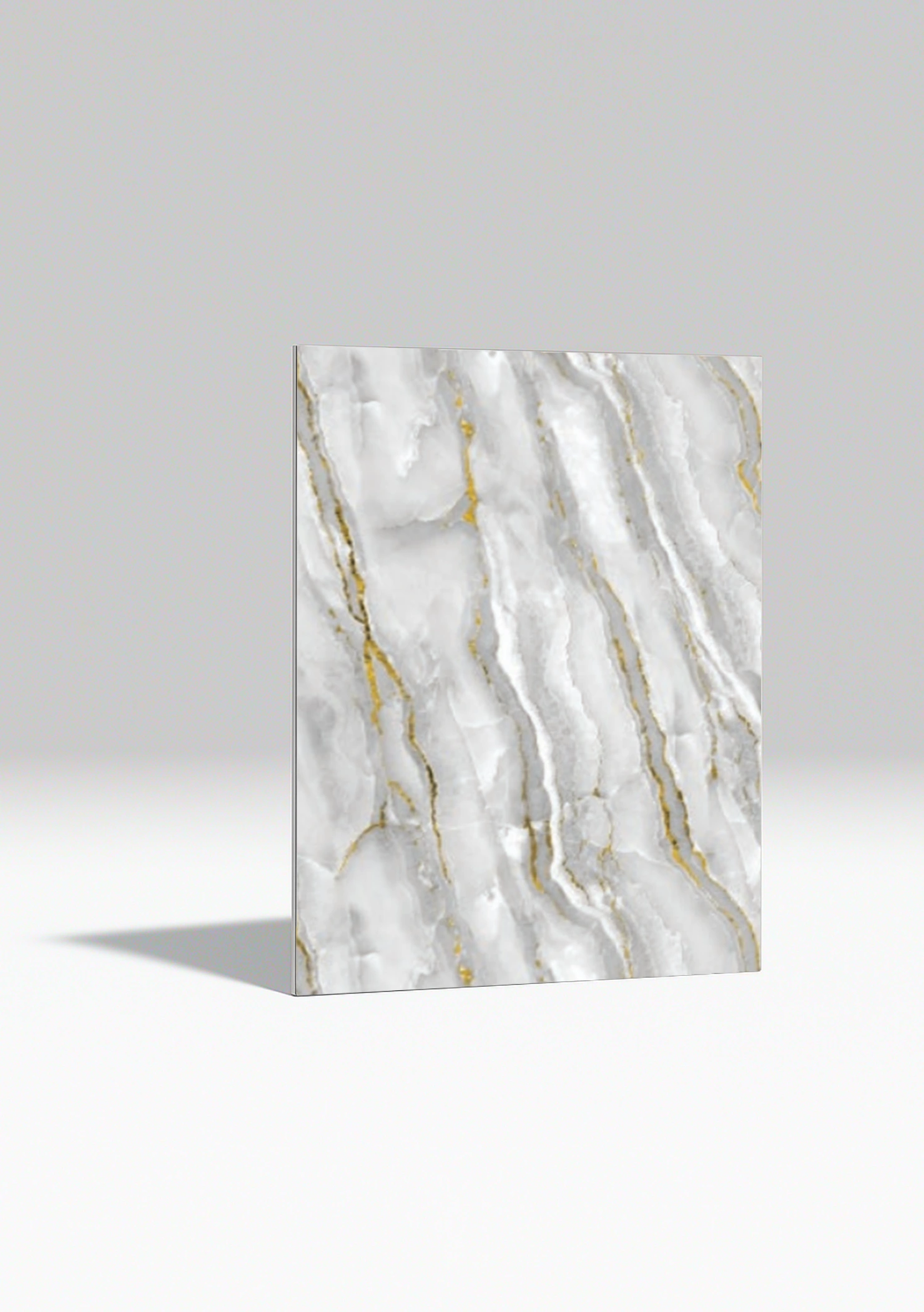 Gold Mist PVC márványhatású falpanel a luxus és elegancia harmóniáját hozza el otthonodba. A fehér és szürke márványhatású alapot aranyló erezet díszíti, amely különleges, prémium megjelenést kölcsönöz minden térnek. A fényűző arany mintázat finom kontrasztot alkot a hűvös kőhatással, így a panel egyszerre modern és klasszikus hangulatot áraszt.